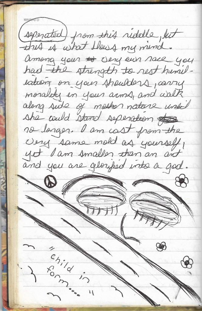 I can see you in me, or me in you, whichever you choose. The music that once filled your ears with mellow tones of melancholy still plays on through mine. It’s a great feeling to dose yourself with the relaxation of valium, the creativity of marijuana, and the warm glow of a candle that rests on an old cassette player. There is nothing better than serene nights spent alone engulfed in personal expression and worldly echoes. Ancient ancestors whisper a family secret that is too well hidden to ever surface again. But this cannot be so, for those of us who have lived through secrets of the past know how prevalent they are.
