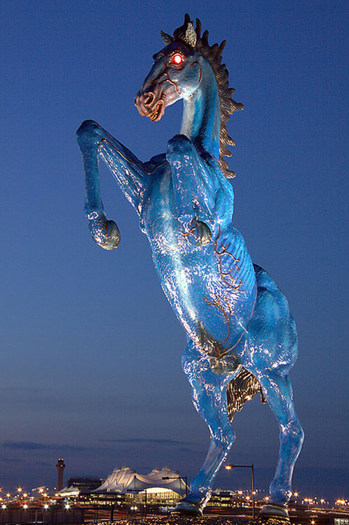 I arrived at work that morning to see the parking lot overflowing with shiny, new, unidentified cars. We were surrounded, but I zeroed in on one car in particular, one shiny, new blue mustang parallel parked right outside the front doors. I steadied my breath and headed inside to face the music. This was also during the height of my ongoing struggle with It—the dark cloud that had overtaken my life, the grand conspiracy in which this website is dedicated to exposing. The significance of the blue mustang is discussed in my memoir, but for this post, we’ll keep it simple. Its use in pop culture is extensive, popping up in movies and music videos alike, usually driven by the villain or antagonist of the plotline. Most notably, the blue mustang pops up, not as a car, but as a 32-foot-tall horse outside of the Denver Airport.